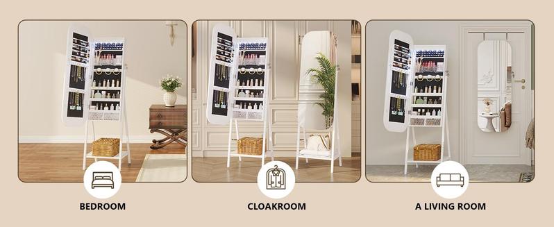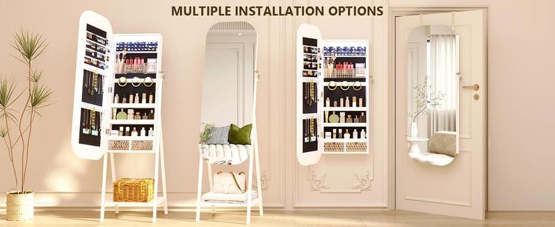 The jewelry armoire has 2 door hangers for door mounted and wall hook for wall mounted. It is lockable with a key and features Magnetic catch and sturdy metal hinge to ensures safety and protection for your items