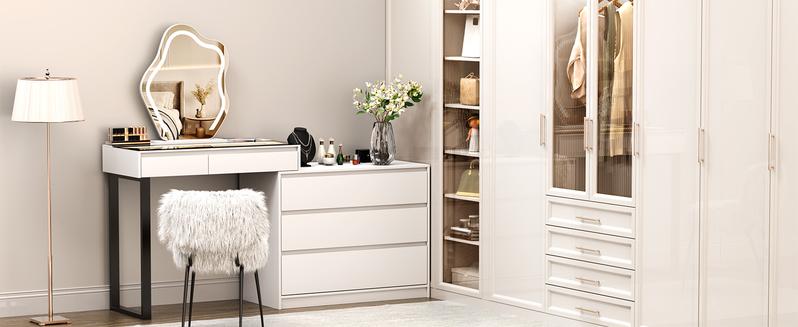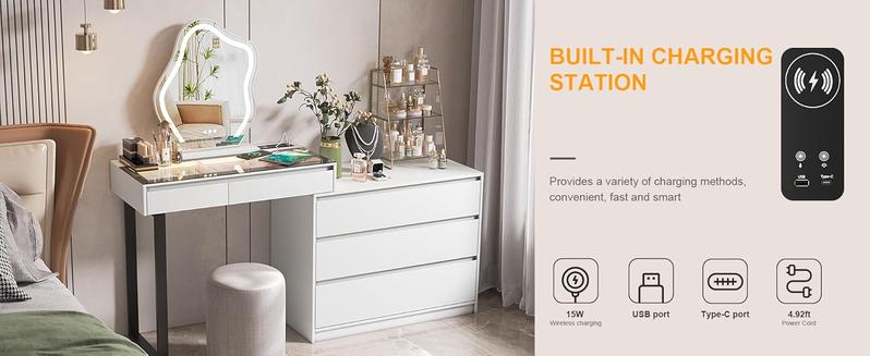 This modern makeup vanity with 15W fast wireless charging, 1x USB, 1x Type-C port, meet the charging needs of different devices such as mobile phones and tablets, making it easier to take selfies or live broadcasts.