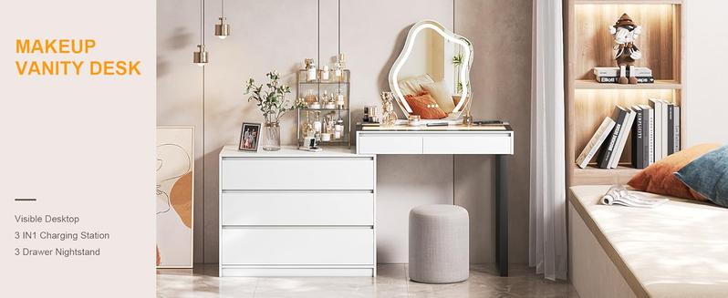 Miu Extendable Dressing Table with Drawers and Dresser, Corner Vanity Desk with Mirror and Lights, with Charging Station