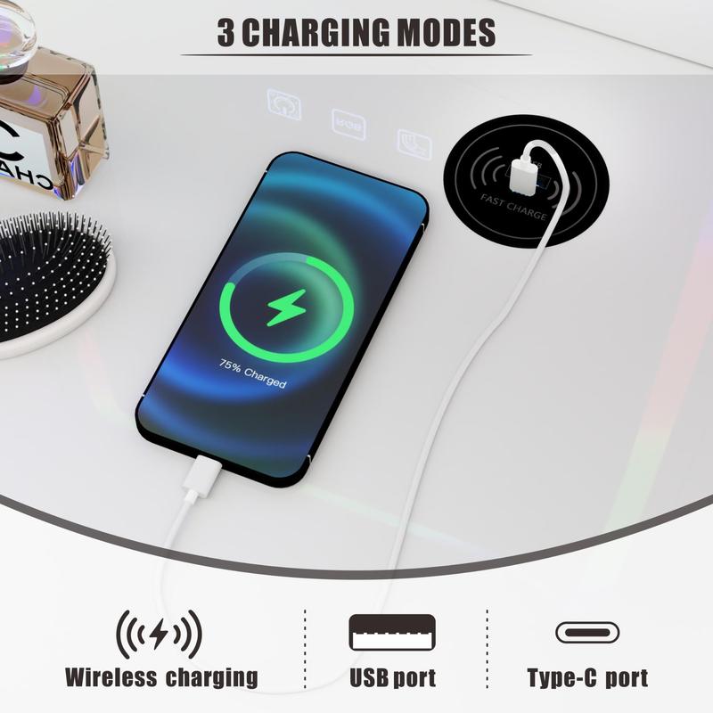 Modern makeup table with 1x USB port, 1x Type-C port and wireless charging station design, easily charge your electronics without having to search for a separate power source