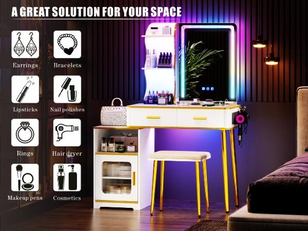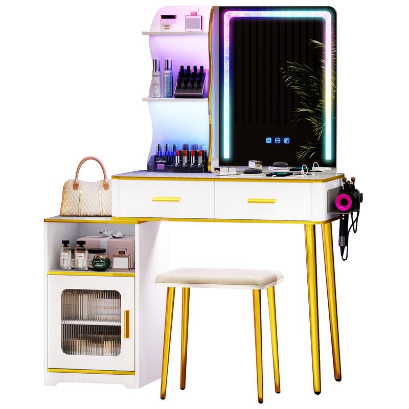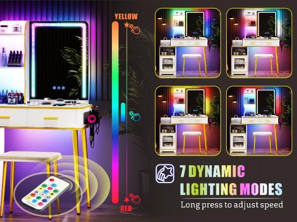 Dressing table comes with 7 Dynamic and 7 Static LED lights, brightness 0%25-100%25 adjustable to meet different requirement, one-touch control RGB lights with intelligent memory function, ensures you always return to your preferred ambiance