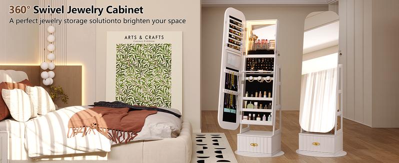 Miu Round-Corner Design Full-Length Mirror with 360° Swivel & LED-Lit Features, Bottom Drawer Storage, Lockable Design Brush Cabinet