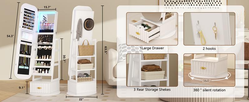 Standing at 63.5 inches tall, 22 inches wide, and 15.7 inches deep, this cabinet is both compact and spacious. Its thoughtful layout includes hooks, dividers, and compartments, making it a perfect addition to any room. The silent rotation mechanism ensures quiet and seamless access to all storage areas.