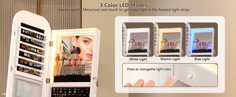 The cabinet’s top mirror rotates smoothly, offering 360° access to your jewelry and cosmetics. Integrated with three adjustable LED light modes (white, warm, and blue), the mirror provides optimal lighting for makeup application or jewelry selection, blending functionality with modern elegance.