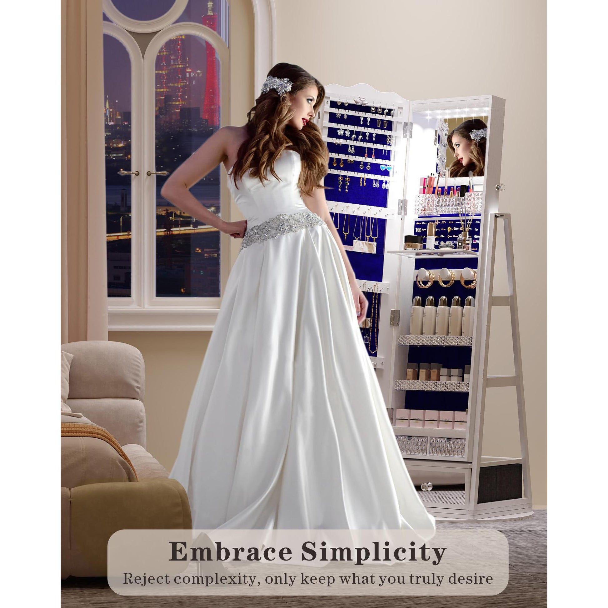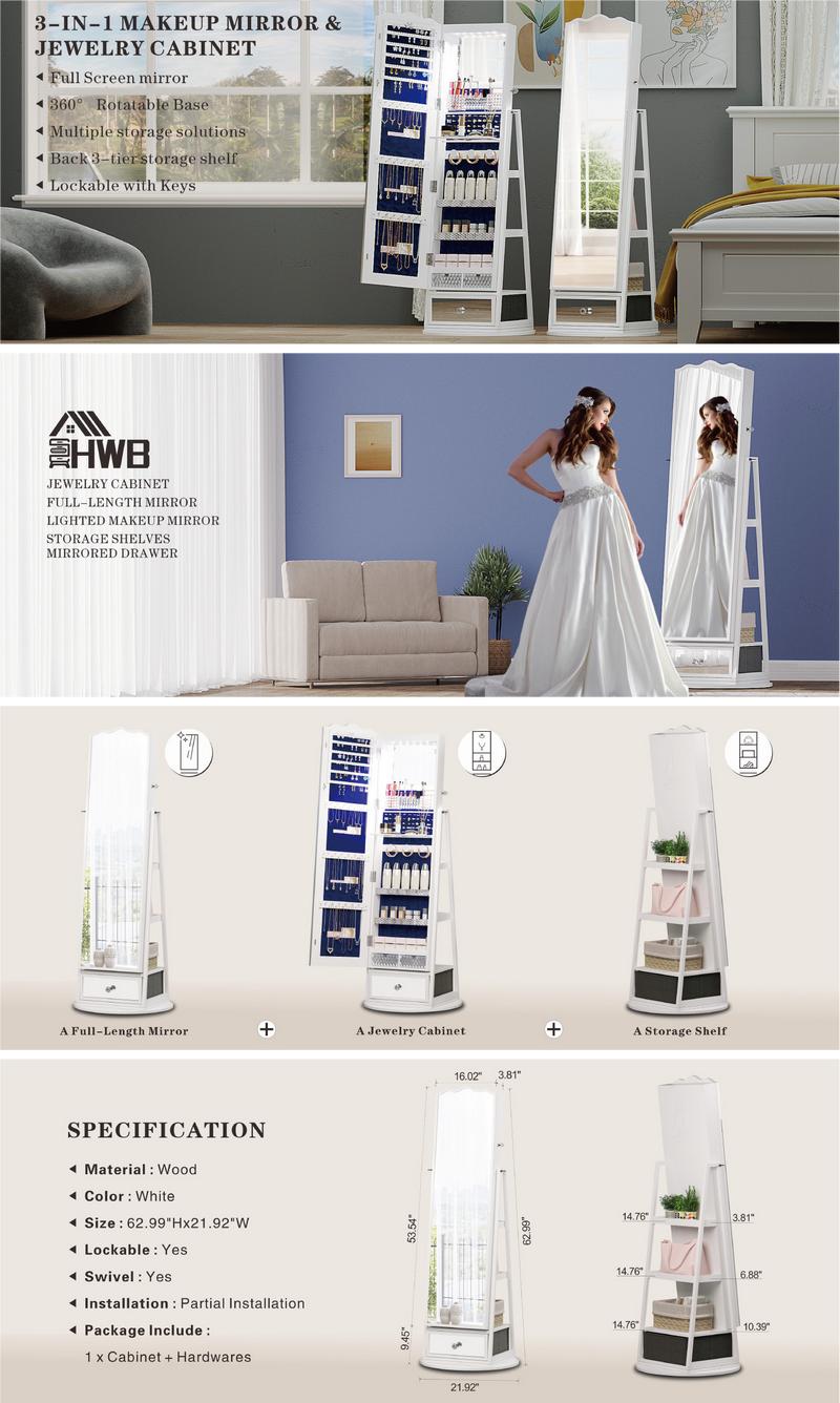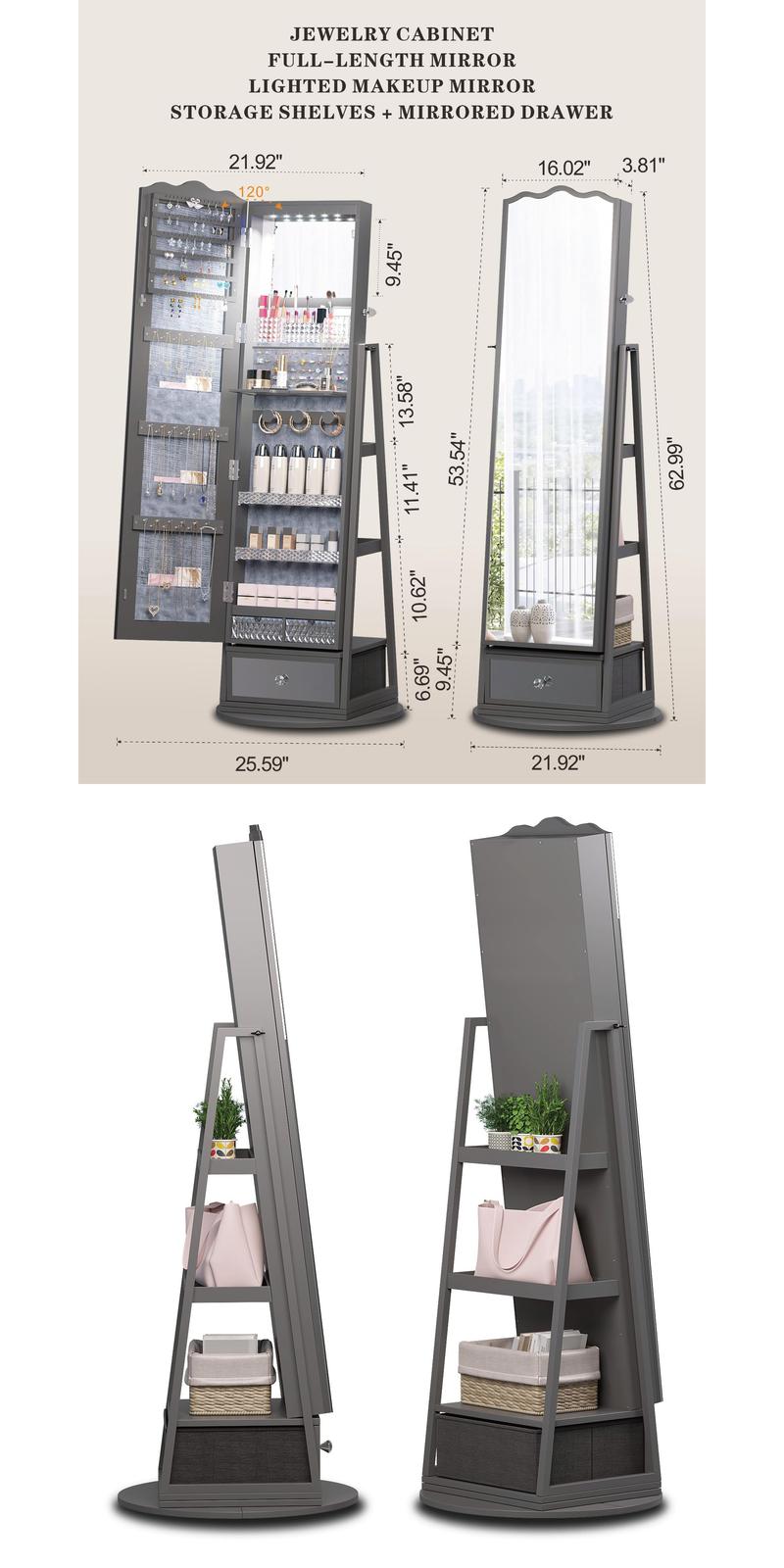 Our stylish and functional freestanding rotating full length mirror jewelry cabinet! This versatile piece of furniture is a perfect addition to any modern home. With its dual makeup mirrors - including a full-length mirror with lights and a built-in makeup mirror.