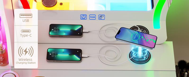 [HD Mirror: Clear, crisp reflection for your daily grooming needs., 7-Drawer Chest: Offers ample space for keeping essentials tidy., 7-Color RGB Lights: Customize lighting to suit your mood., Wireless Charging: Stay connected without wires., Adjustable Brightness: Fine-tune the light intensity effortlessly.]