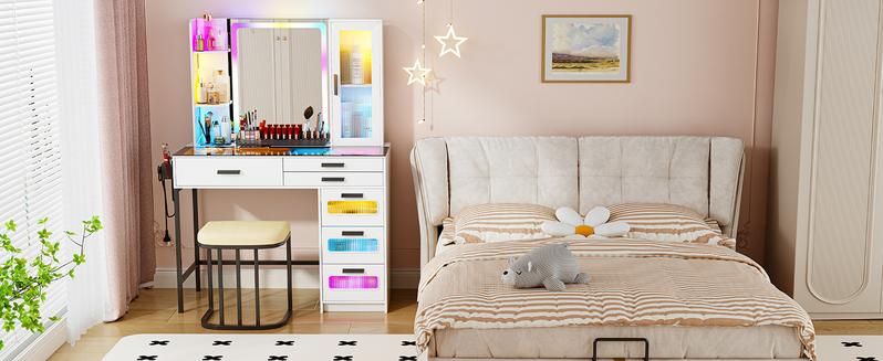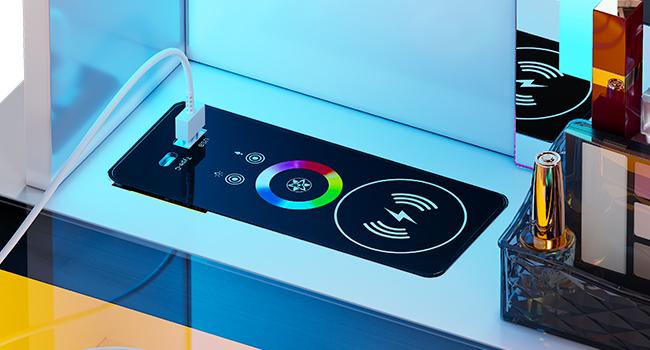 [【Size + Color]】Vanity Size: 15.7"D x 39.5"W x 54.3"H; Makeup Desk Color: White/Black/Grey., 【3-IN-1 Charging Station】vanity with wireless/USB/type-c charging station, Meet the charging needs of your different electronic products, 【RGB Lighting】 Dresser comes with dynamic and static lighting and a remote control allowing you to control it remotely,You can also feel the light in your body., 【Unique design】the desktop is made of tempered glass, your jewelry at a glance, make-up time can immediately lock the target, also like a jewelry showcase, 【Big Storage】The vanity table has 3 tiers of open and hidden storage shelves, drawer with jewelry organizer box, different storage, better storage for our skincare jewelry and more!, ️【Easy to assemble】We are equipped with detailed assembly instructions, if you have any questions, we have a professional team to answer your questions and solve your problems]
